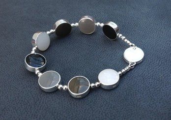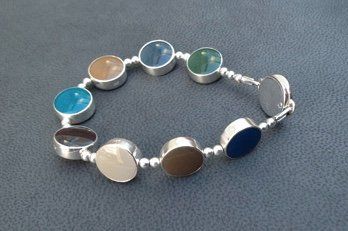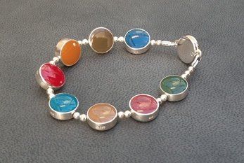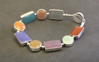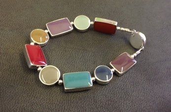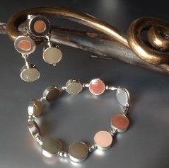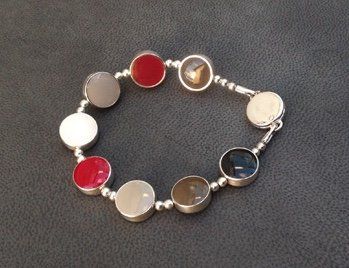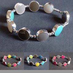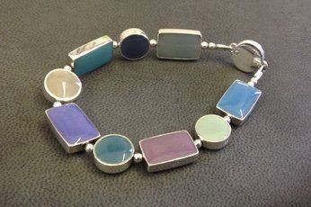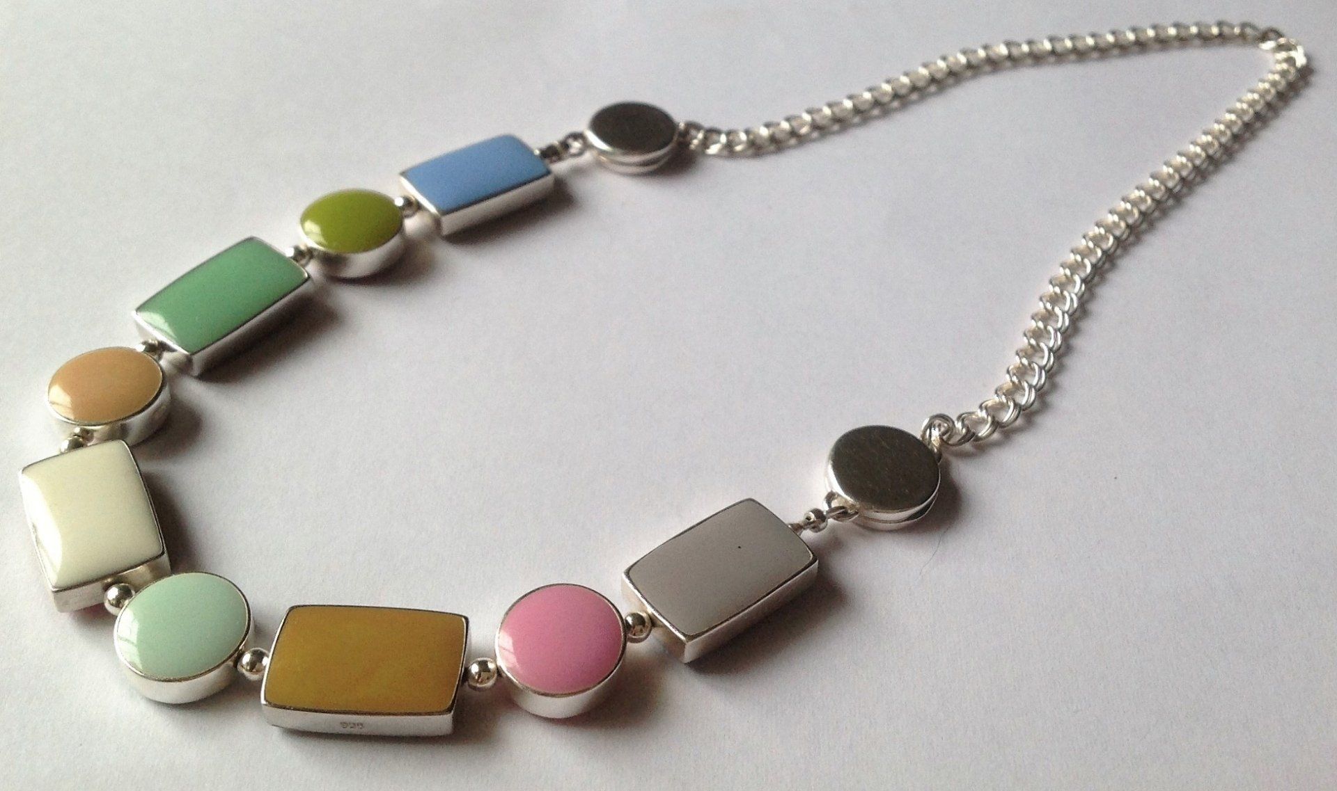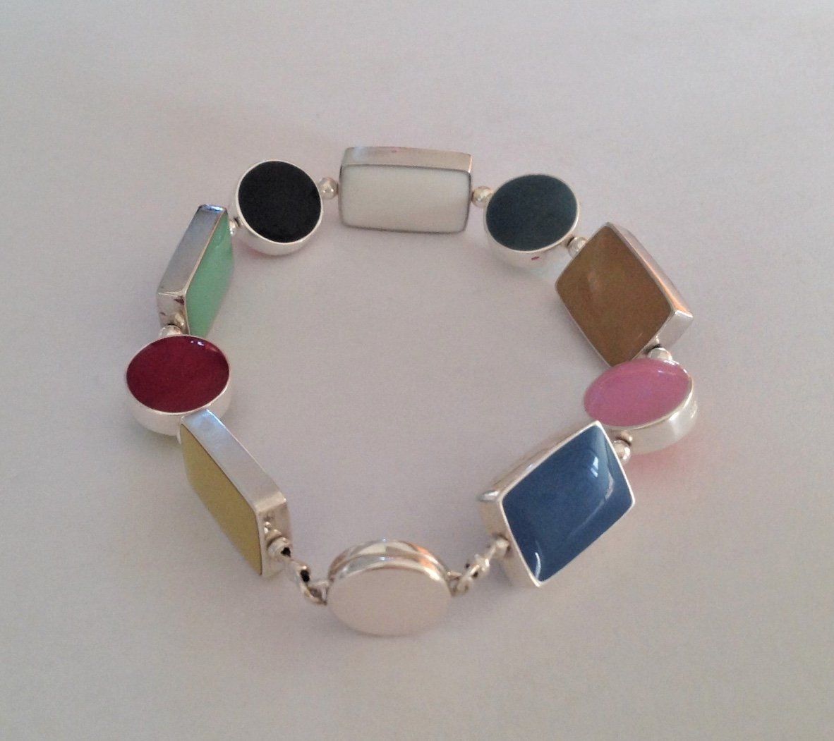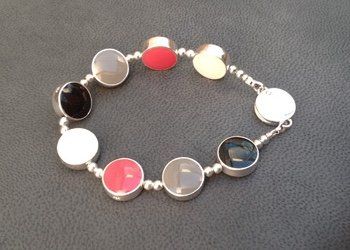 Sarah has created seven core colour ways of hand mixed, high lustre resin enamel. Each bracelet or necklace has reversible sterling silver links, each link turns independently giving you eighteen colours and an endless choice of combinations to suit your mood or outfit.