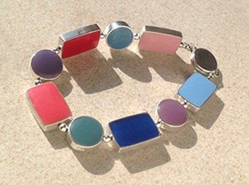 Sarah has created seven core colour ways of hand mixed, high lustre resin enamel. Each bracelet or necklace has reversible sterling silver links, each link turns independently giving you eighteen colours and an endless choice of combinations to suit your mood or outfit.